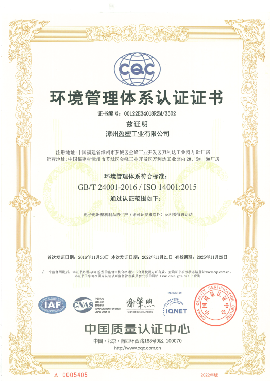 漳州盈塑工業(yè)有限公司成立、通過(guò)ISO9001、 ISO14001體系認(rèn)證